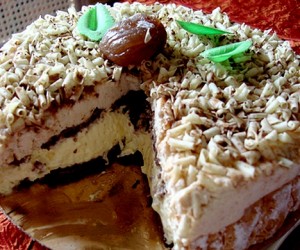 Démoulez le gâteau, nappez le avec une crème réalisée à partir de jaunes d’œufs, de sucre, de chocolat et de beurre.