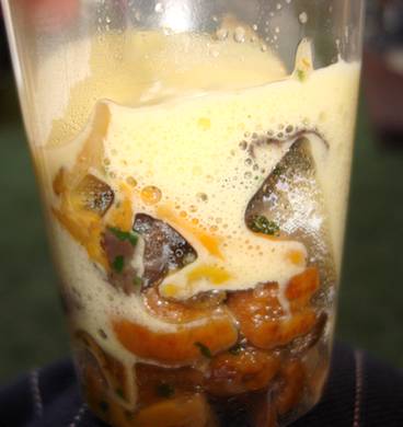 ajouter ensuite et dans cet ordre, les sparassis, les pieds de mouton et les chanterelles communes. Dès que les champignons sont cuits, ajouter les autes ( pieds bleus, mousserons et trompettes de la mort) retirer les gousses d’ail et le thym de la poele.