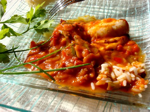 Ingrédientes : 1.5 kg de pollo troceado, 3 pimientos, 2 cebollas, 3dientes de ajo, 1/2 c à café de pimenton dulce, 100 gr de jamon de bayona o de jamon serrano, 5 c soperas de aceite de oliva, 400 gr de pulpa de tomate, 15 cl de vino blanco seco, 1 ramillete de hierbas aromaticas, sal y pimienta recien molida.