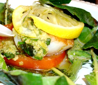 Papillotes de coquilles saint jacques en feuilles de figues, tomates, grappe figue et copeaux d’artichaut, tapenade d’olive verte au citron ;