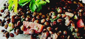 Faire revenir 1 oignon et une gousse d’ail dans un peu de graisse de canard, ajouter les lentilles (vertes du Puy de préférence) et mouiller moitié eau moitié bouillon de poule si possible. Joindre un bouquet garni à la première ébullition.