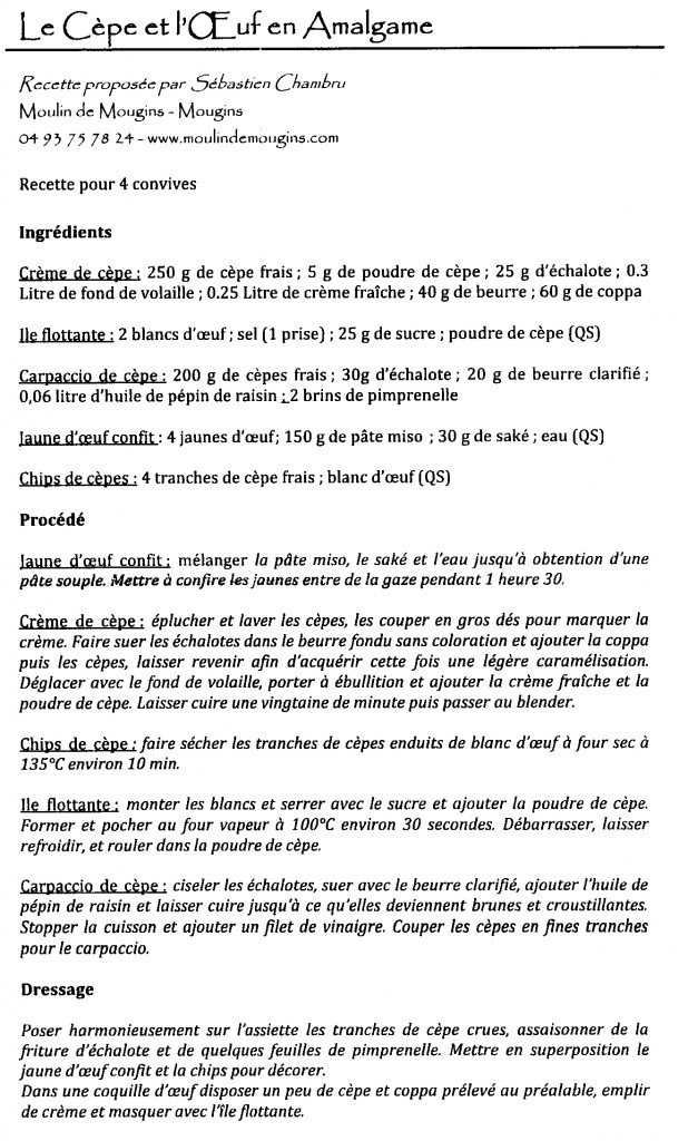 recettes de grands chefs étoilés, recette du restaurant du Moulin de Mougins, par le chef Sébastin Chambru, proposé aux 100 étoiles de mougins, en 2009, voici la recette du cèpe et oeuf en amalgame.