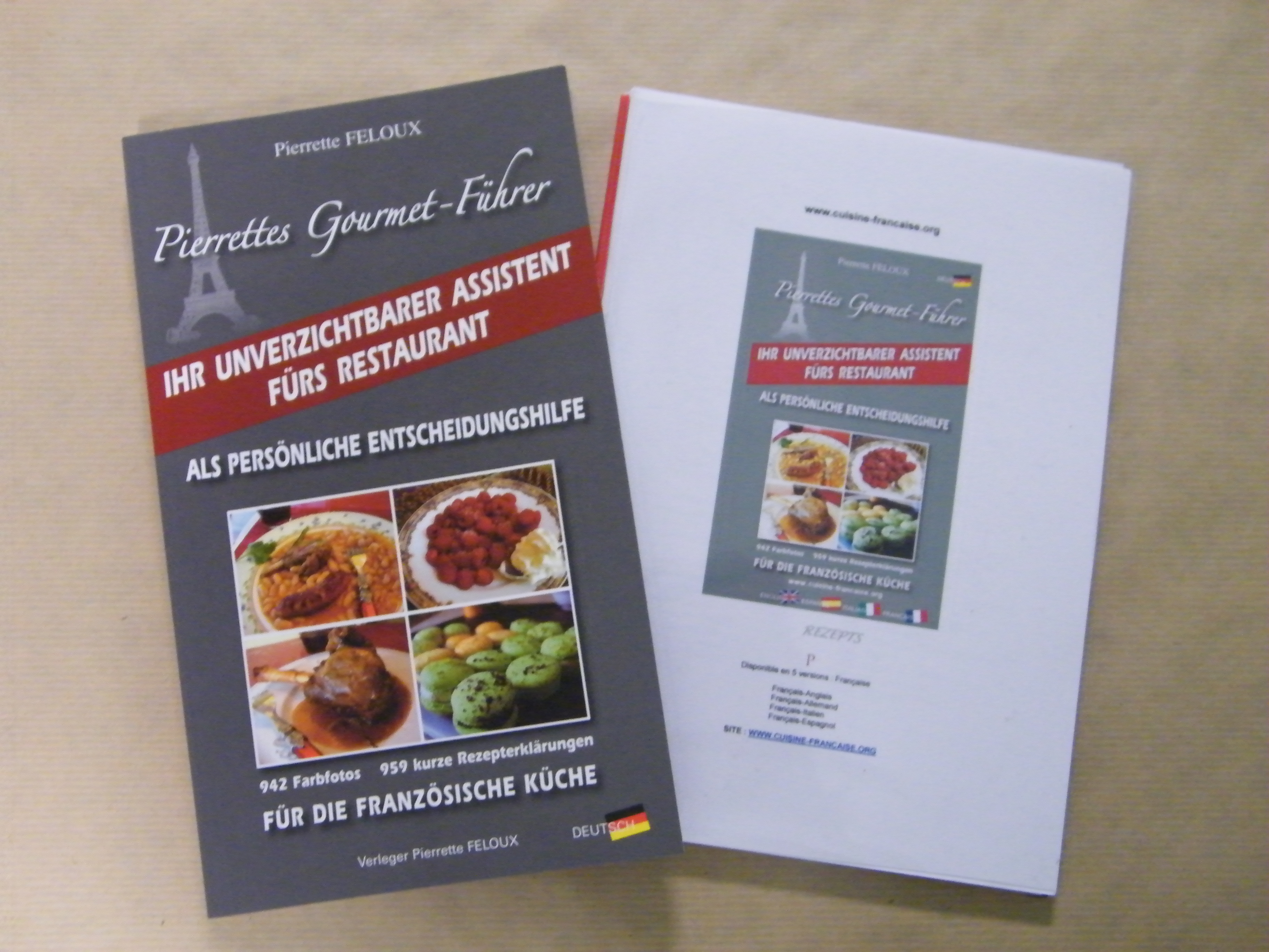 - L’achat de livres de cuisine française sur le site Internet de Pierrette ne s’effectue que sur le site d’achat du guide de Pierrette. En effet quelques points de vente existent, la liste et sur le site du livre, seul l’achat de livres de cuisine française de Pierrette sur Internet propose différents prix et offre 100 recettes traduites pour l’achat des livres de cuisine française.