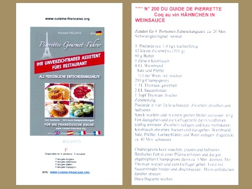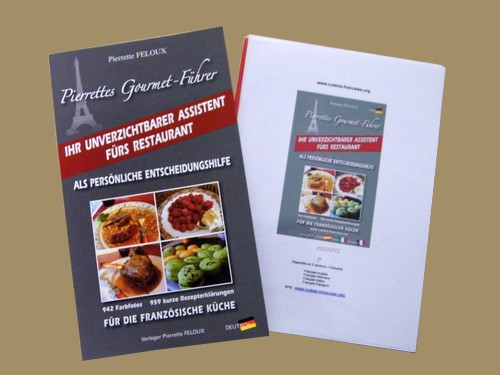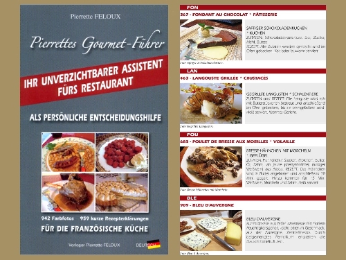 Die Autorin Pierrette hat 959 authentische und typische Gerichte, Spezialitäten und Nachspeisen der traditionellen Küche verschiedener Regionen Frankreichs ausgewählt. PIERRETTES GOURMET-FÜHRER ist von berühmten französischen Starköchen wie Joel ROBUCHON und Marc VEYRAT ausdrücklich gelobt worden und wird auch durch Kochschulen anerkannt: Die Internetseite bietet auch das Buch CORDON BLEU (Fotos)